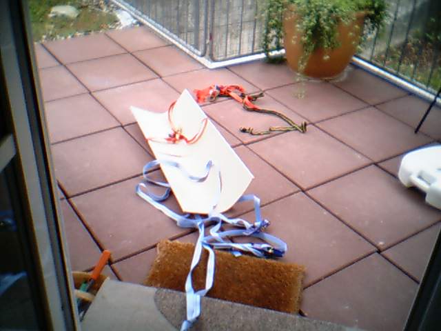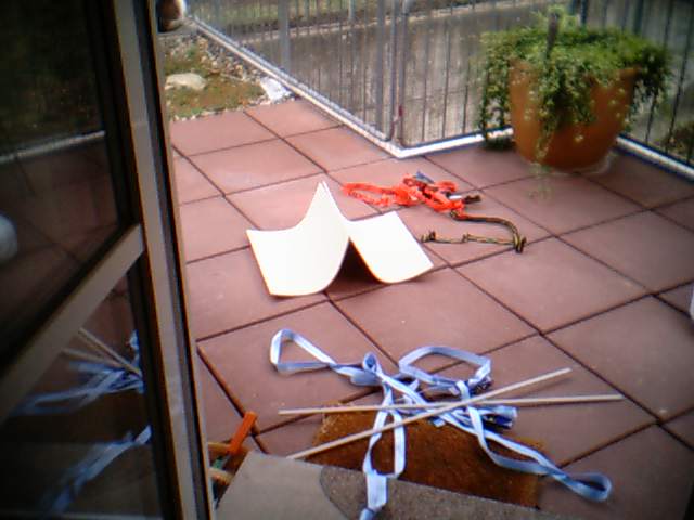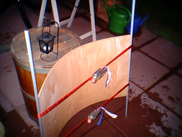 Aus diesem Grund haben wir unsere Dachhälften wohlweislich mit querer Maserung zurechtsägen lassen und können munter loslegen. Wir brauchen nun die beiden Aluprofile, die Spanngurte, ein altes Bügeleisen oder auch ein Heißluftgebläse wenn man hat, und am besten einen Platz, an dem wir mit Wasser herumsauen dürfen. Optimal ist eine Terrasse. Balkon geht auch, wenn es einen ordentlichen Regenwasserablauf hat. Sonst müßten wir uns zur Not in das Badezimmer zurückziehen und in der Badewanne herumhantieren. Also, wie besprochen: Aluprofile auf das Brett, Spanngurte drumrum und leicht anspannen, daß sich das Brett schon mal leicht wölbt. Bitte schon jetzt darauf achten, daß alle Spanngurte gleichmäßig und in kleinen Schritten angezogen werden. Ist erstmal eine kleine Wölbung drin, bekommt das ganze Konstrukt auch Stabilität. Wasser aufsetzen und zum kochen bringen. Herdplatten heizen effizienter als Wasserkocher, brauchen aber auch länger. Je mehr und je schneller ich Wasser aufkochen kann, um so zügiger läuft die ganze Geschichte ab. Im nächsten Schritt die Innenseite als erstes mit dem kochendem Wasser langsam übergießen. Das Brett dazu am besten hinlegen, damit das Wasser möglichst langsam abfließt und viel von der Hitze an das Holz abgibt. Nun anfangen, die Spanngurte abwechselnd und in kleinsten Ratschenschritten zu spannen. Das Spannen sollte dabei leichtgängig sein. Wird es schon etwas zu “anstrengend” ist das Holz an seine vorläufige Belastungsgrenze gestoßen. Dann wieder mit kochendem Wasser übergießen, damit die Fasern wieder flexibel werden und weiterspannen. Nach wenigen Minuten sollte das Brett schon so aussehen: Und hier sehen wir auch schon gleich zwei Fehler, die ich begangen habe! Zum einen habe ich das Brett nun doch längs zur Faserrichtung gebogen. Zum anderem sind das keine zwei getrennten Dachhälften, sondern noch ein einziges, großes Brett, welches ich anschließend in zwei Teile sägen wollte. Das Ergebnis könnt Ihr Euch denken. Nach dem Durchsägen hatte ich zwei quasi plane Bretter an deren Enden eine leichte Krümmung zu erahnen war. Das sah bescheiden aus. Dies war also mein erster Biegeversuch und ich lernte daraus. Die einzelnen Bretter mußte ich nochmal biegen. Damit beide Dachhälften eine annähernd gleiche Biegung bekommen, spannte ich sie gleichzeitig und übereinander (nicht aufeinander) in die Aluprofile ein. Auch hier wieder beachtend, schrittchenweise nachzuspannen und heißes Wasser aufzugießen, sobald der Spannwiderstand anwuchs. Nach jedem “Aufguß” ließ sich die Sache wieder leichter spannen. Und hier begang ich schon wieder den nächsten Fehler! Wie dem obigem Bild zu entnehmen ist, hatte ich nur zwei Spanngurte, was für das eine Brett auch ausreichend war. Nun bog ich aber zwei Bretter, die zusammen die doppelte Länge hatten, aber dafür halb so schmal waren. Schmalere Bretter erfordern einen höheren Kraftaufwand zum spannen. Die Kraft verteilte sich über die zwei Spanngurte schlecht, bzw. wirkte nur punktuell auf die Aluprofile und... verbog diese. Wer ein Paar krumme Aluprofile gebrauchen kann, möge sich bei mir melden! Nunmehr also Aluprofile und zwei Spanngurte nachgekauft (die mir seitdem auch anderweitig gute Dienste leisteten) und meine vier Spanngurte gleichmäßig über die Länge der Aluprofile verteilt. Dann ging´s weiter (bzw. wieder von vorne los) wie gehabt: Heißes Wasser drauf, alle Spanngurte nacheinander um eine Ratsche angezogen, und immer wieder um eine Ratsche angezogen, bis der Widerstand anwuchs. Wasser drauf, spannen... usw. Man kann dem Holz auch noch Hitze zuführen, indem man es mit einem Bügeleisen bearbeitet. Die Feuchtigkeit verdampft dabei und dringt als heißer Wasserdampf tiefer in das Holz ein, um es auch dort noch zu erwärmen. Das funktioniert freilich nur auf der Außenseite. Für die Innenseite (bzw. grundsätzlich) wäre ein Heißluftgebläse optimal (aufpassen, daß die Spanngurte nicht durchschmelzen). Als ich dann ungefähr zwei Drittel der Biegung hinbekommen hatte, ließ ich es für den abend sein und legte den Aufbau hin, damit sich die Fasern einen Tag lang an die Spannung “gewöhnen” konnten. Beim Hinlegen stellte ich fest, daß der gesamte Aufbau in Torsion lag, also verdreht war, die Aluprofile liefen nicht mehr parallel zueinander. Um dem entgegenzuwirken, legte ich für die Nacht Gewichte auf die Enden der Aluprofile. Am nächsten Tag war von der Torsion nicht mehr allzu viel zu sehen. Im zweitem Durchlauf bog ich dann die Hälften auf meine Wunschkrümmung zurecht und sogar noch etwas stärker, da ich fürchtete, daß sich die Bretter später wieder zurückbiegen würden. Diese Sorge war nur teilweise begründet. Wenn man´s richtig macht, biegt sich das Holz erstaunlicherweise kein bißchen zurück. Dies passiert nur, wenn das Holz wieder feucht wird. Und feucht wurde es nur einmal, als der Sprühkleber draufmußte. Nun, da die beiden Bretter die Wunschkrümmung haben, legen wir sie zum auskühlen und austrocknen in eine trockene Ecke und werden uns ihnen in einer Woche wieder zuwenden. Nach einer Woche ausgiebiger Trocknungszeit sieht das Endergebnis hoffentlich so aus: Die Spanngurte hatte ich vor Ungeduld schon entfernt, bevor ich das Foto machte. Die Aluprofile sind aber noch drauf. Das gleichzeitige Einspannen beider Bretter beschert den Erfolg, daß beide Bretter die gleiche Wölbung haben. Erfreulicherweise schwangen die Bretter nicht ein bißchen zurück, sondern behielten die Krümmung bei, als ob sie diese schon immer gehabt hätten. Die Torsion des Gesamtaufbaus ist noch andeutungsweise zu erahnen, wirkt sich aber nicht negativ auf den späteren Gesamtaufbau aus. Probehalber habe ich die beiden Bretter schonmal in “Dachstellung” aneinandergelehnt: Ja, doch, man kann sich das Dach in etwa vorstellen. Dem aufmerksamen Betrachter wird nicht entgehen, daß im “Dachfirst” ein ziemlich krummer Spalt klafft. Keine Sorge, dem widmen